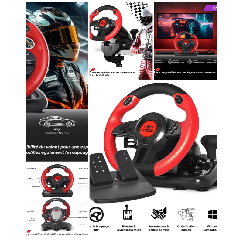 Volant et pédales de jeu Vidéo Race Pro Wheel 1 compatible WINDOWS 11/ PC SPIRIT OF GAMER PROGRAMMABLE 6 boutons