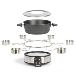 Caquelon en revêtement antiadhésif Capacité 1,8 L Thermostat ajustable avec indicateur lumineux de chauffe Plateau tournant avec coupelles à sauces en acier inoxydable Range câble intégré, 8 fourchettes à fondue et collerette anti- éclaboussures