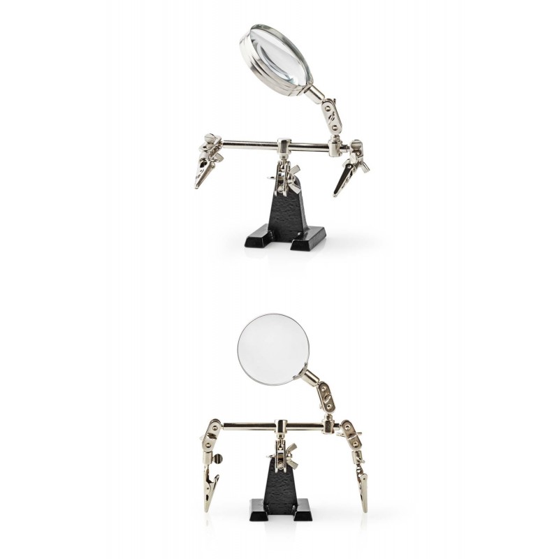 Cette troisième main répond à tous vos besoins de brasage, soudage et modélisation, elle vous permet par exemple de fixer un circuit imprimé ou des bijoux. Elle laisse les mains libres et est équipée d'une loupe pour vous permettre de travailler de façon très précise.