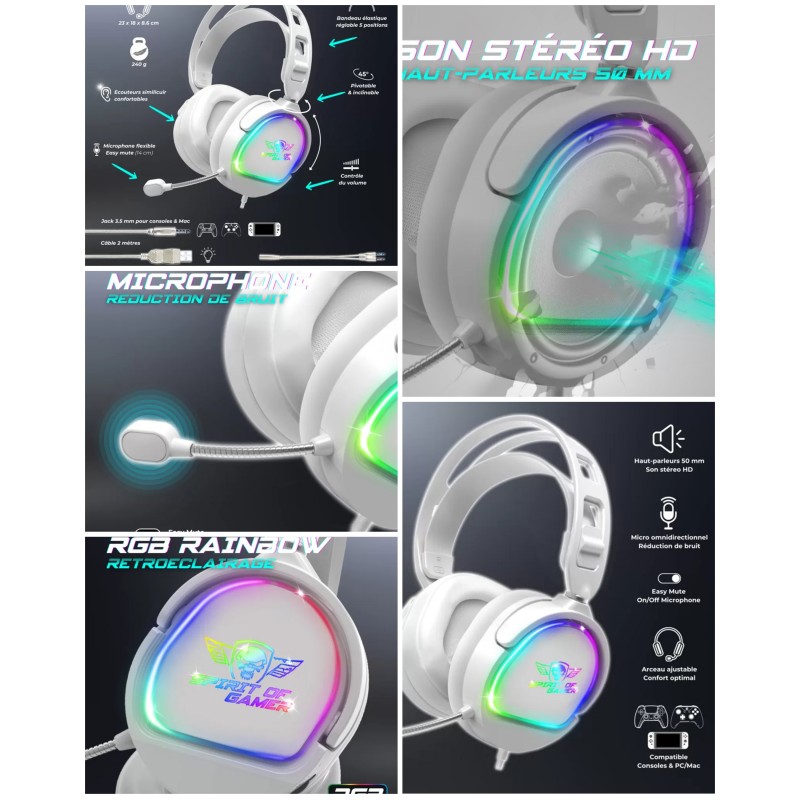 Casque Gamer Blanc SPIRIT OF GAMER PRO-H6 LEDS RGB PC/MAC SWITCH PS5 - XBOX SERIES X|S pour Gaming