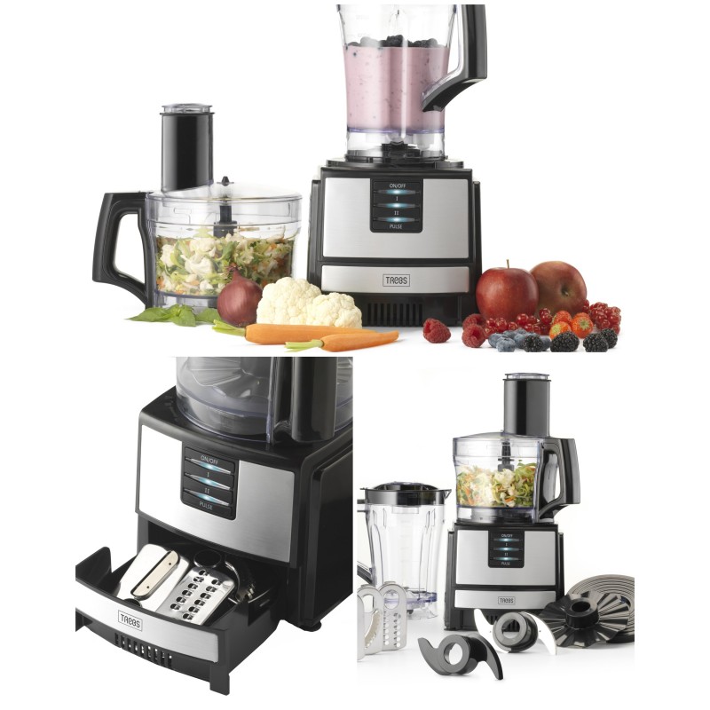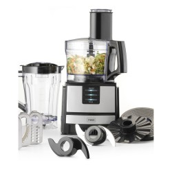 • Accessoires inclus : lame de coupe en acier inoxydable, 2 disques de coupe/râpe, disque râpe extra-fin, accessoires de pétrissage