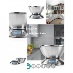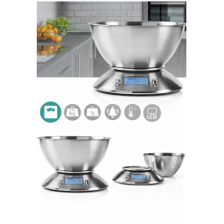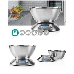 Balance de cuisine numérique avec thermomètre et réveil intégrés pour peser les ingrédients jusqu'à cinq kilogrammes. Elle est fournie avec un bol amovible en acier inoxydable facile à nettoyer.
