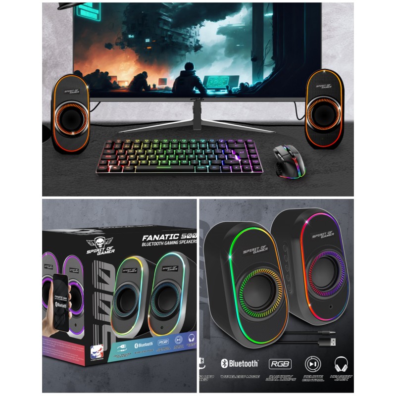 Pratique ! FANATIC 500 est doté de tous les atouts pour s'intégrer parfaitement dans votre environnement sonore. Il est équipé d'une prise casque en façade (micro non supporté) et comprend des câbles Jack et USB de 1 m, ainsi qu'un câble de 75 cm reliant les deux enceintes. Ce système d’enceintes est le choix parfait pour ceux qui recherchent un son puissant et une connectivité multiple dans un format compact et élégant.