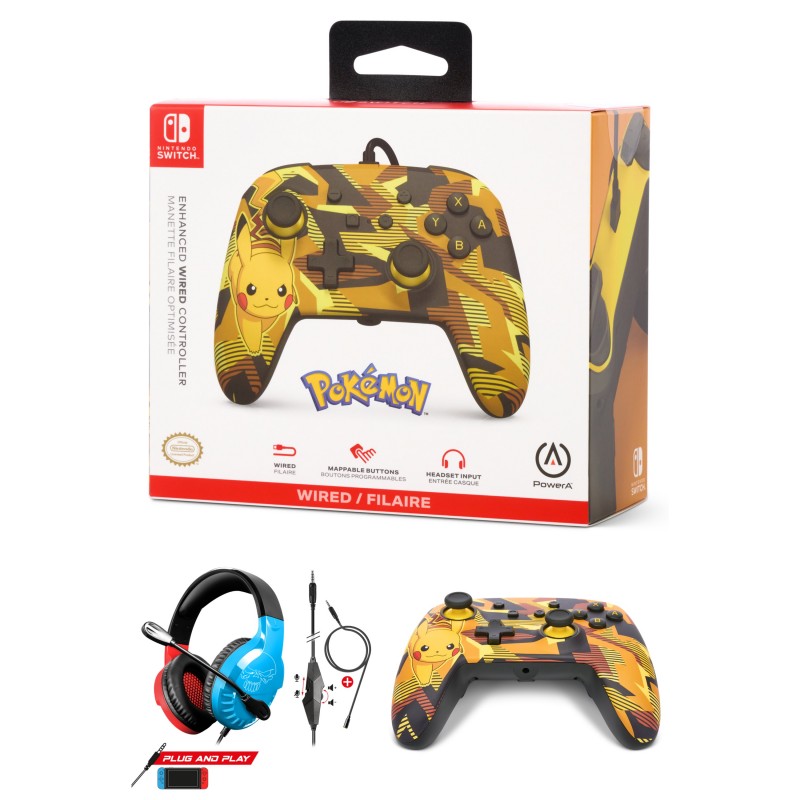 Casque PC Switch Nintendo rouge et bleu + Manette filaire SWITCH Officielle Camo Storm Pikachu