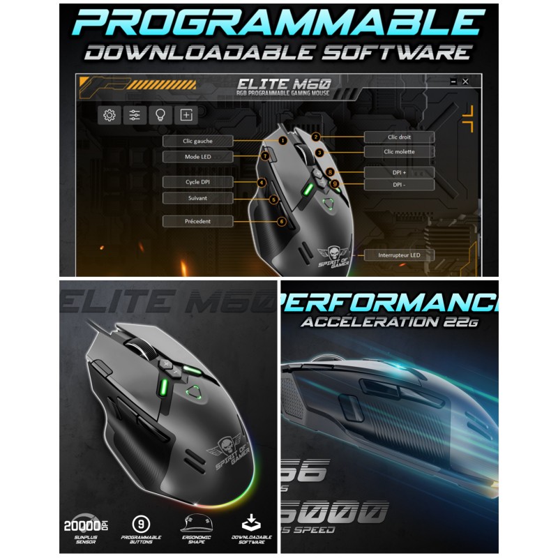 Prenez le contrôle avec ELITE M60 : Mettez toutes les chances de votre côté avec la souris ELITE M60, conçue pour les joueurs à la recherche de performance. Son capteur optique haute précision offre une résolution réglable jusqu’à 20 000 DPI, avec 6 niveaux personnalisables pour s’adapter à votre style de jeu.
